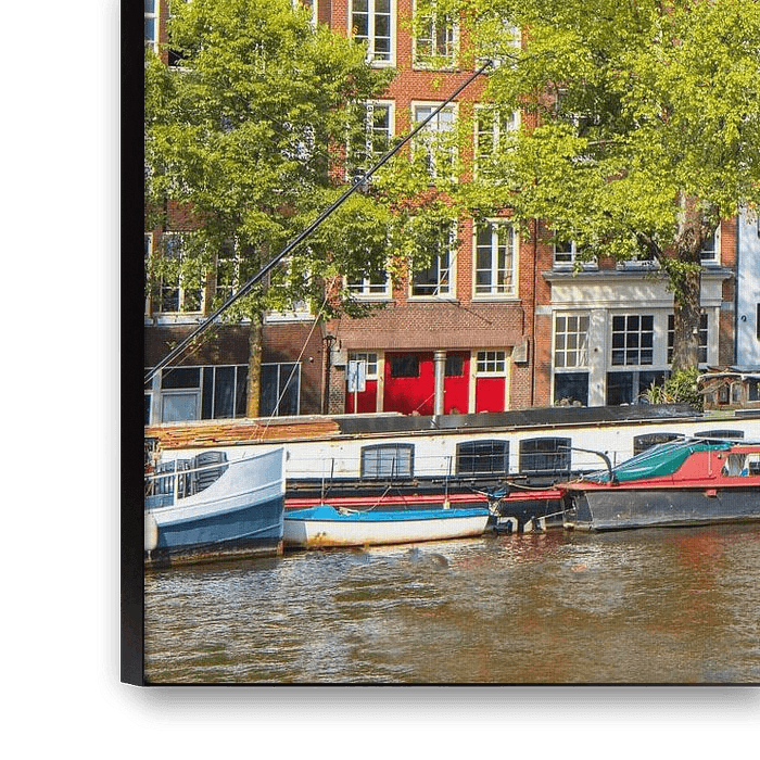 Amsterdam Groenburgwal with the Zuiderkerk tower and a blue sky in the background.