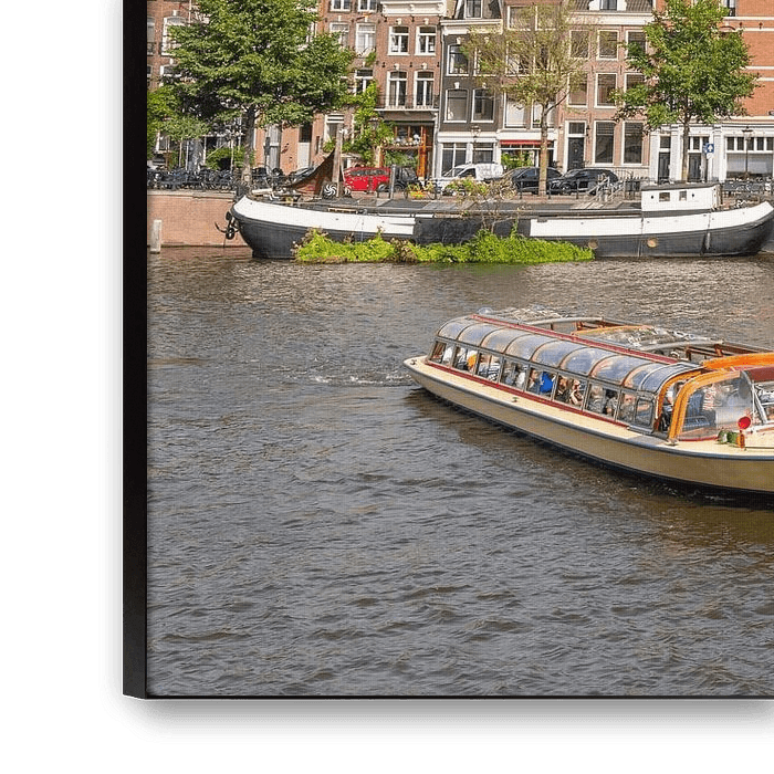 Amsterdam tourboat at the river Amstel with a blue sky in the background.