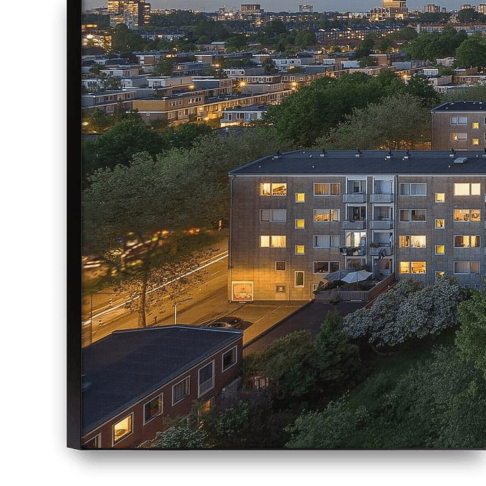 This work shows a panorama of the city of Amsterdam during the blue hour. In the foreground is the Sloterhof complex, from where the photo was taken from an 11th floor window.