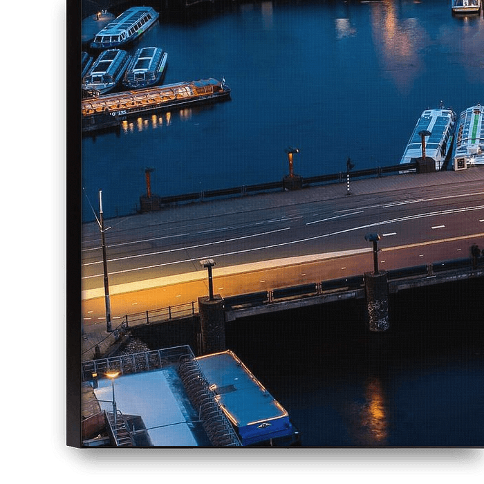 Amsterdam on the move. From the roof of Level Eleven a photo was taken with a lot of dynamism during the blue hour. Traffic, public transport, cyclists, pedestrians, canal boats. One of the busiest places in our capital.