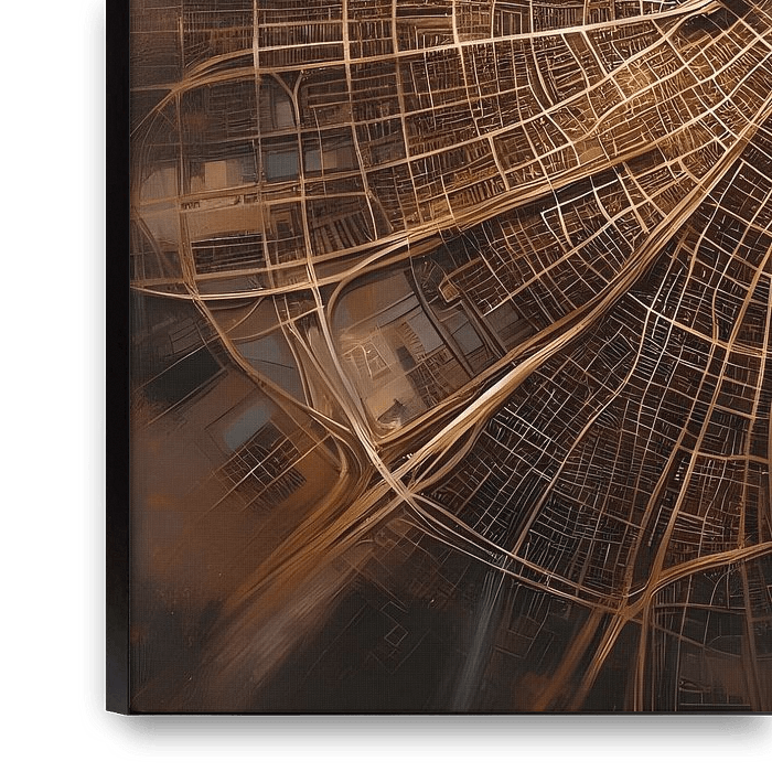 Discover the enchantment of Amsterdam with this playful abstract work, in which golden and brown tones dance across the city's map, bringing its vibrant energy and charming atmosphere to life. Hang it up and be taken on an artistic cruise through the canals and streets of Amsterdam, where every detail promises a new adventure.