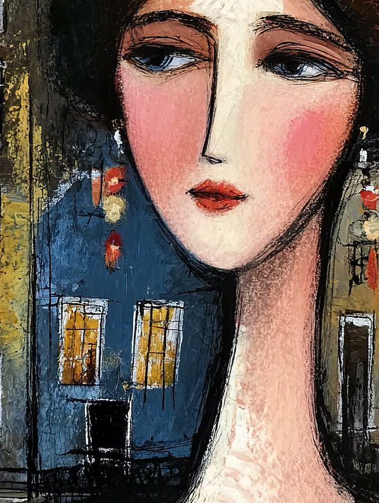 Amsterdam painting - This women's painting shows a woman wearing a striking necklace and earrings, while colourful houses can be seen in the background, giving a cosy cityscape.