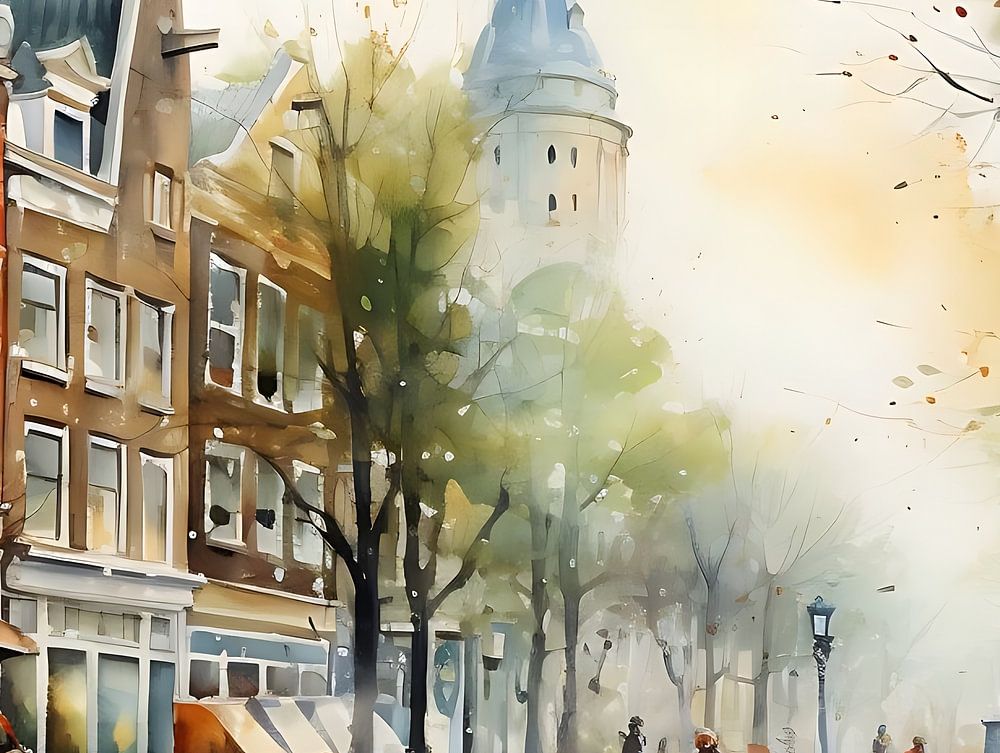 In this sketch of a painting of Amsterdam, the city comes alive with vivid lines and evocative brushstrokes. The outlines of the canal houses and bridges are carefully captured, with the characteristic architecture exuding a sense of history and charm. The canals themselves are rendered with wavy lines, and boats bobbing in the water. The sketch suggests the vibrant energy of Amsterdam, with playful details artfully capturing the city's atmosphere.