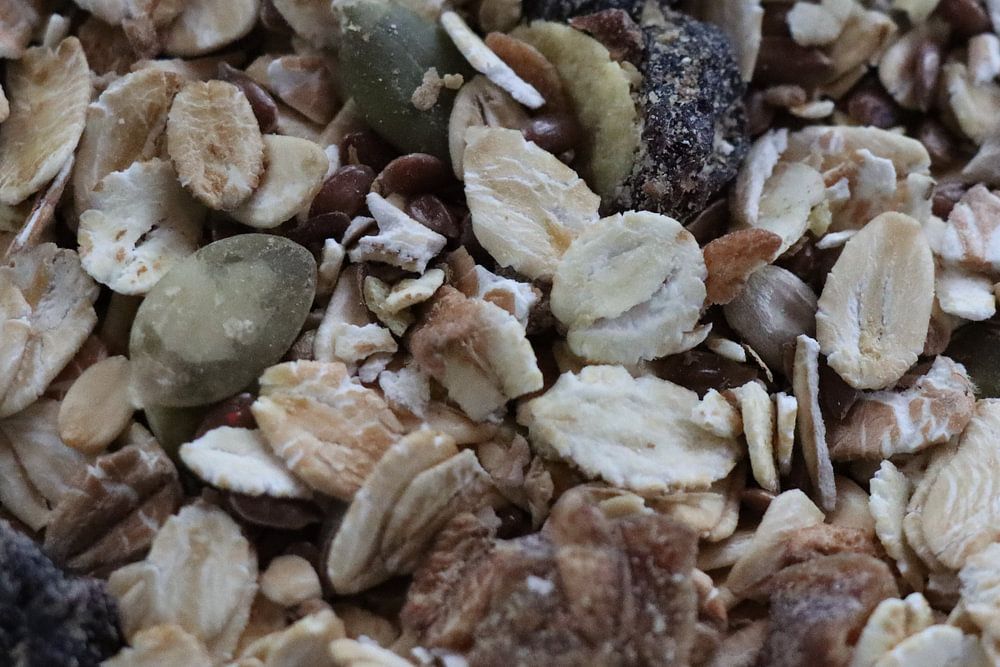 The texture and warm tones of this beautiful close-up of muesli tell a story of tranquillity and simplicity. Every fibre and seed seems like an invitation to enjoy the small moments, like a peaceful morning with a bowl of nutritious breakfast. The balance of natural colours, from the deep brown of nuts to the pale gold of oat flakes, exudes an earthy sense of well-being.
