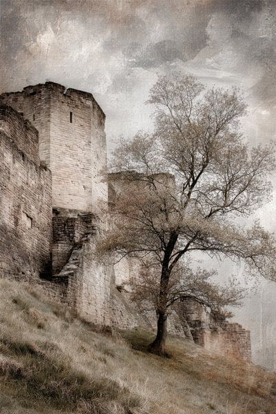 An old castle on a green hillside, beneath a dramatically cloudy sky. The slender tree in the foreground brings a touch of poetry to the rugged landscape. The grey-green tones and weathered stone convey a sense of tranquillity, history and…