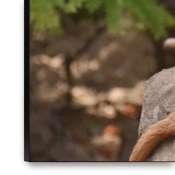Buy the photo An alert meerkat at its lookout post by Krümel_Visions on canvas, ArtFrame, poster and wallpaper, printed on demand in high quality.