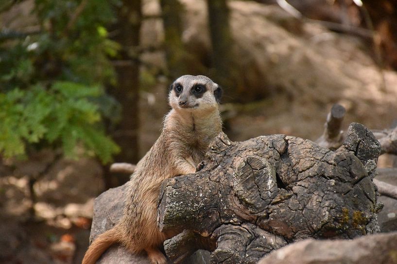 This high-quality nature photograph features an alert meerkat sitting attentively on a large, weathered tree trunk, observing its surroundings. The background depicts a warm, natural landscape of rocks and forest floor with a soft bokeh effect, ensuring that the viewer’s gaze remains firmly fixed on the animal. The harmonious brown and…