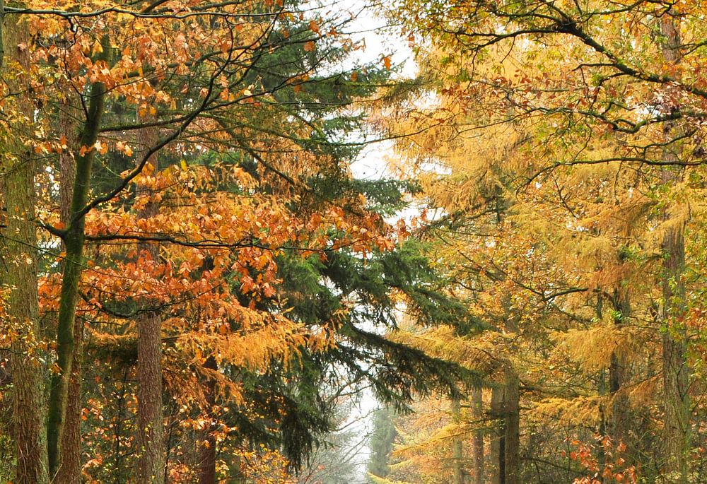 A photograph of a hiker in an autumnal forest. The path in the middle gives depth to the image and the person at the end of it shows the grandeur of the trees.