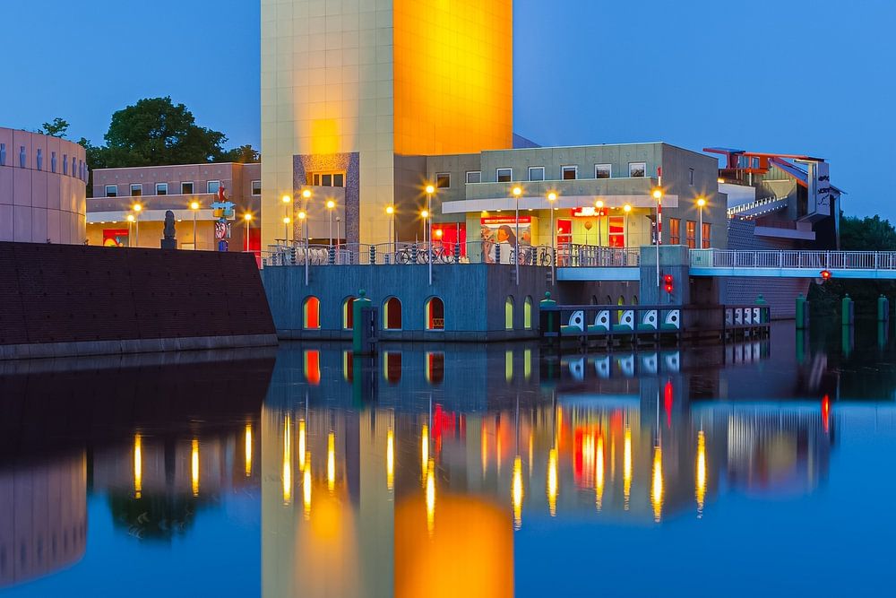 The multicoloured structure in the water is a work of art in itself, a postmodern building in the middle of Groningen's ring of canals. This daring building was designed by Italian Alessandro Mendini in collaboration with De Luchi, Starck and Coop Himmelblau.