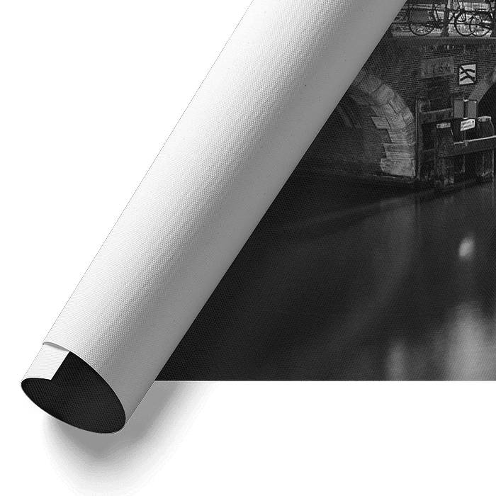 A Black and White photo taken in the evening showing the wide view from the Paper Mill Lock at the junction of Prinsengracht and Brouwersgracht in the centre of Amsterdam.
