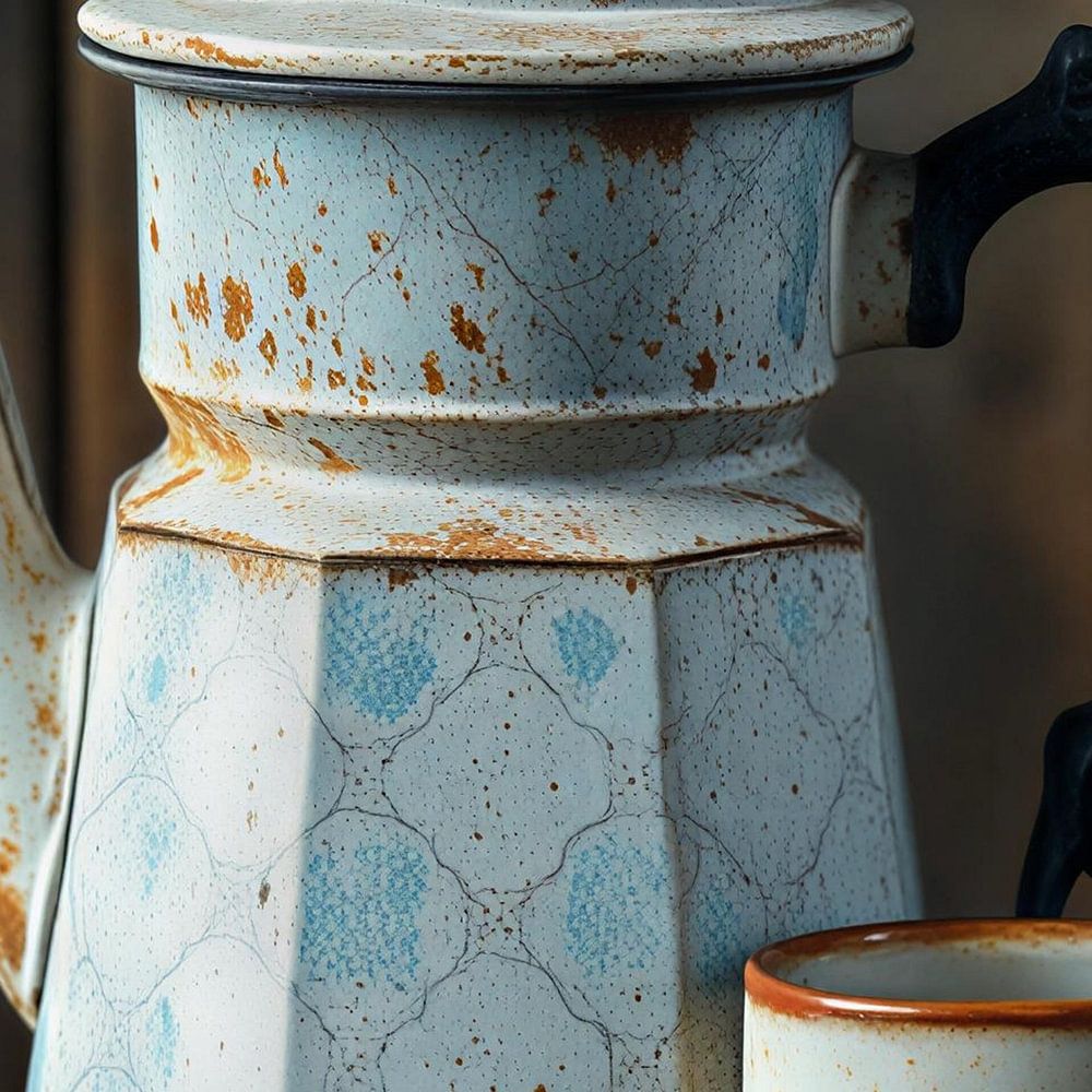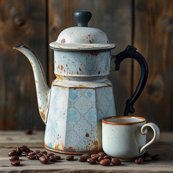 About ‘An old weathered rusty light blue coffee pot with cup.’ by J.a Dijkstra