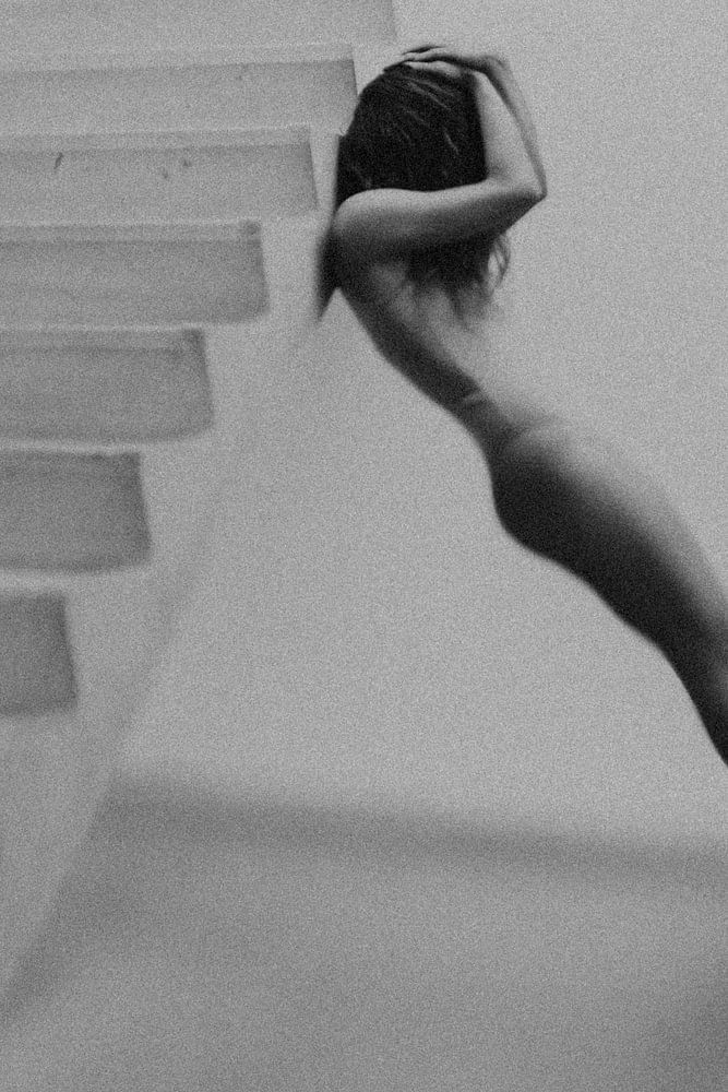 Vertical black and white artistic photo print of woman at concrete staircase which goes nowhere. The feet and foreground are blurry as if she seems to be fixed. Line play. Dreamy.