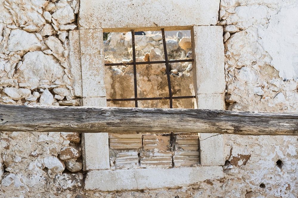 On a wooden beam a cat sits on the left, behind this beam an old dilapidated wall with a window without glass with metal bars in Greece
