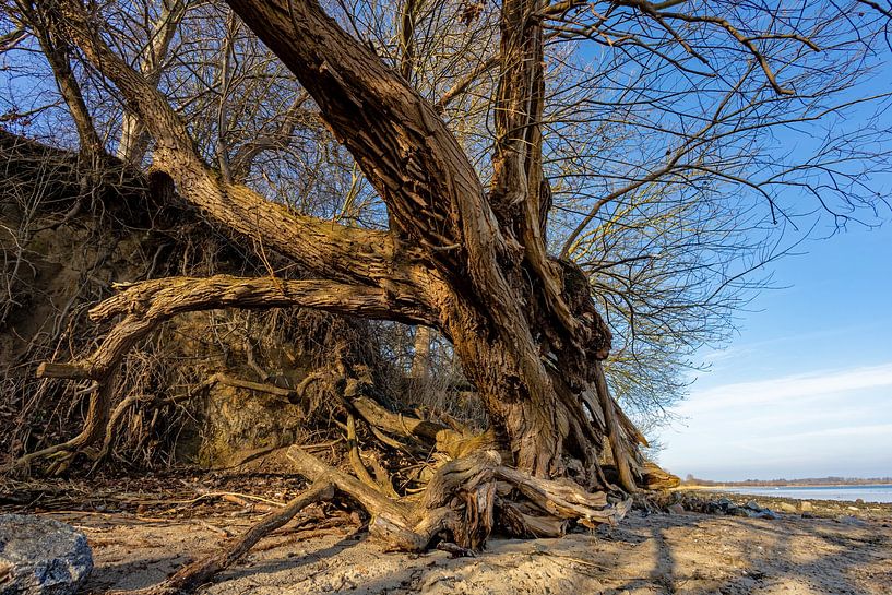 This tree recently had its home above the cliffs of a beach section on the Mecklenburg Baltic Sea coast. Due to wind, rain, heat, frost and other erosion conditions, it has slid down the slope and now has its roots directly at the water's edge in the salty environment. It seems to be endlessly old, but may still be young and is defying…