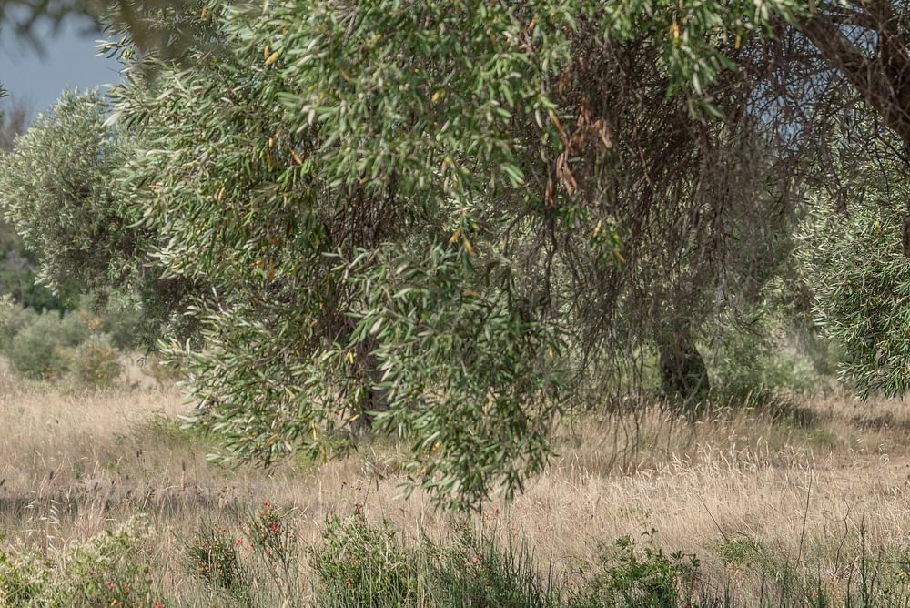 Photo of very old olive trees in France. You can see it hasn't rained for a while and you can feel the dryness. It is in the Minervois region of southern France known for its wine and olive oil.