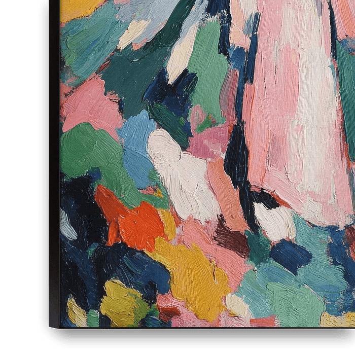 This artwork shows the little angel Michael in full body, painted in the style of Matisse. The oil painting uses expressive brushstrokes in pink, white and yellow, with a colourful, abstract background. The angel wears pink, has large, sweeping wings and a pink halo over her long hair. The exaggerated composition emphasises light and…