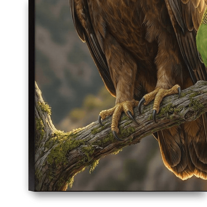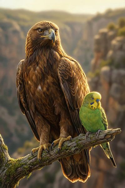 Discover the beauty of contrasts. This fascinating work of art combines the majestic power of a golden eagle with the playful lightness of a small budgie against a breathtaking mountain backdrop.