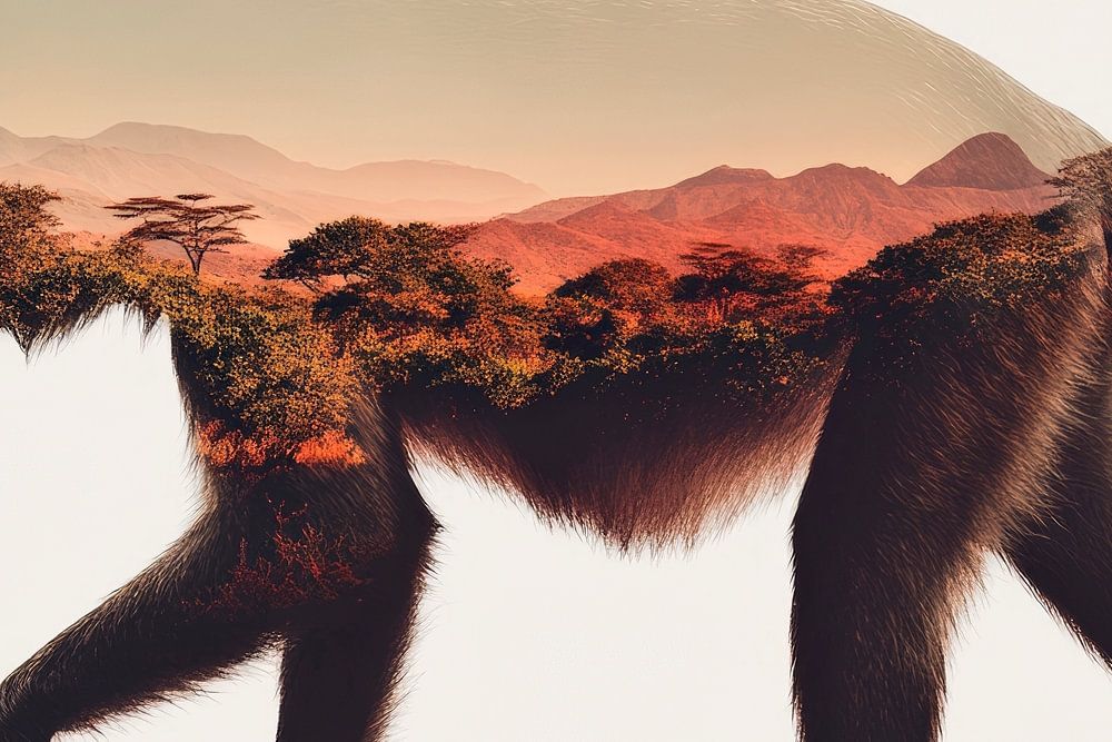A harmonious combination of nature and animal life unfolds in this fascinating work of art. The impressive outline of a monkey harbours the beauty of an African landscape that shimmers gently in the background. This picture brings a majestic aura to any living room and is reminiscent of the wild splendour of nature.