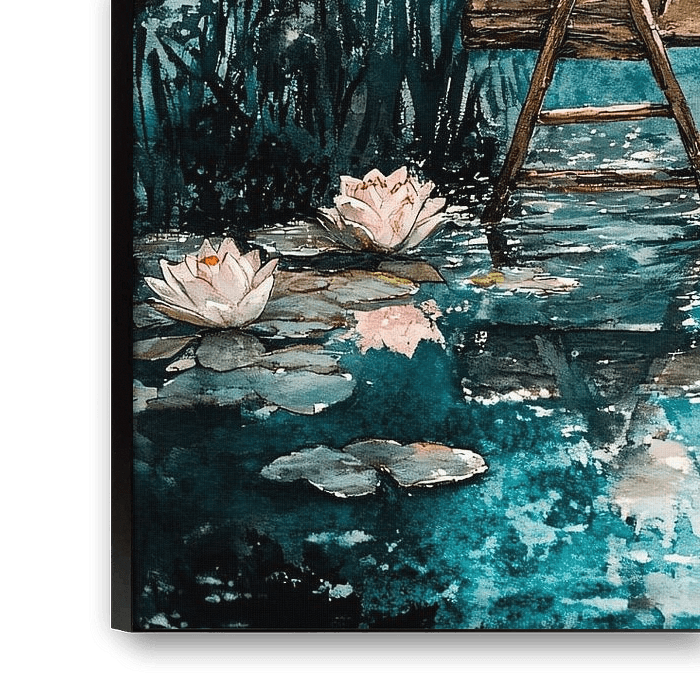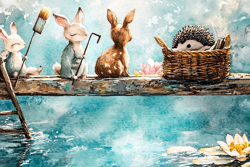 An enchanting design in which a serene, fairytale world comes to life. Three adorable animals sit on a wooden bridge over a pond full of water lilies, with soft lighting and rich watercolours. This artwork exudes a soothing charm that is perfect for any room where a touch of magic is desired. Ideal for lovers of nature and fairytale art.