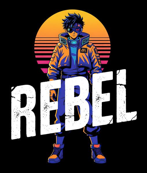 Anime-style character with jacket, against a retro sunset with the word "REBEL" overlaid, all on a black background.