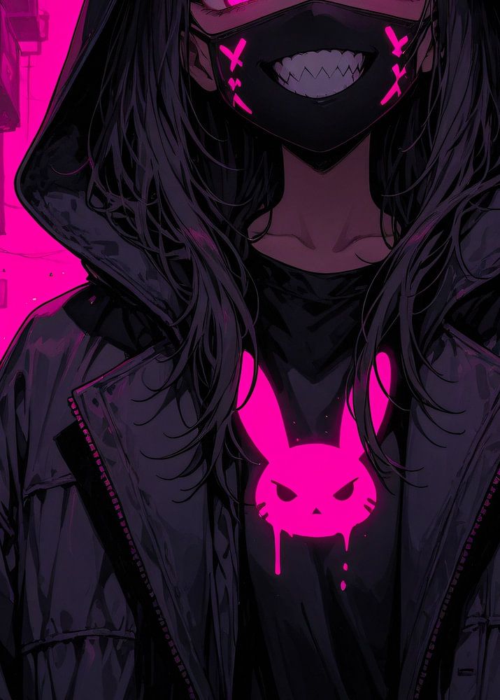 Neon Hare: Blood Signal embodies the moment when rebellion becomes religion. She wears the emblem proudly, painted like blood across her chest, glowing in defiance against the city’s darkness. Her grin cuts like a blade, her eyes burn with fury, and her mask carries the scars of resistance. She is no longer a whisper, no longer a ghost — she is the signal itself, pulsing through every alley, every neon flicker, every terrified heartbeat.
