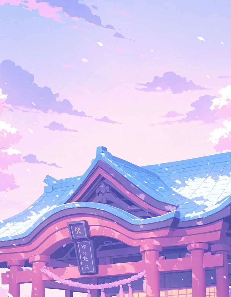 Amid the drifting petals stood the shrine, neither grand nor imposing, but radiant in its quiet dignity. Its red pillars glowed beneath the soft twilight, framed by blooming cherry trees that crowned it with living light.
