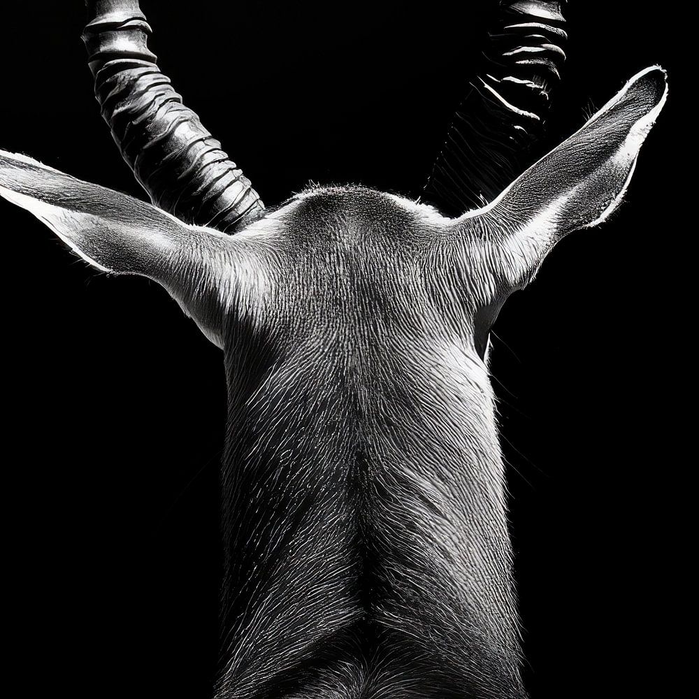 The majestic silhouette of an animal rises up in a gentle interplay of light and shadow. The spiralling horns rise proudly into the air, while the elegant body is cloaked in deep black. This impressive composition radiates a mysterious strength that stimulates the imagination and immediately casts a spell over the viewer.