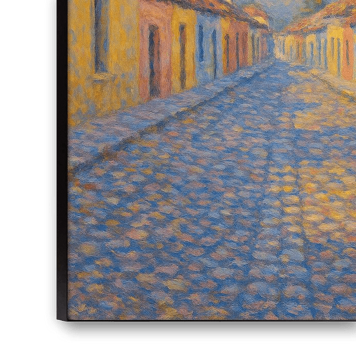 The artist’s technique — short, breathing strokes of pigment — gives motion to silence. Every stone, every wall, seems to vibrate under the warmth of morning. Antigua Morning Impression is not about architecture, but atmosphere; not about geography, but grace.