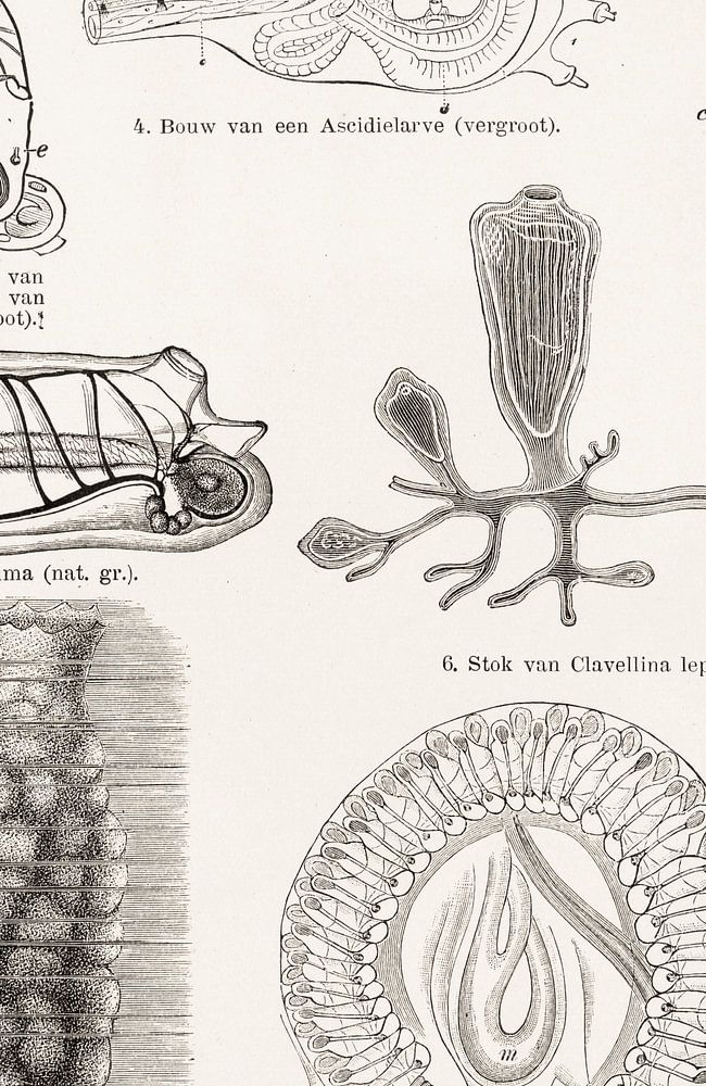 Antique engraving from around 1900 showing a number of mantle animals. Mantids are a sub-tribe of vertebrates and live in the sea. Together with the skull lizards and vertebrates, they form one animal group. They look somewhat like sea anemones by attaching themselves with a foot to a rock. The animals are bag-shaped with a layer around it. While sea anemones have one opening, mantids have two openings where water flows in and out. Water is pumped through the body. They have a stomach, a heart and an intestine. There are up to nearly 3,000 species of tunicates that live in groups or alone.