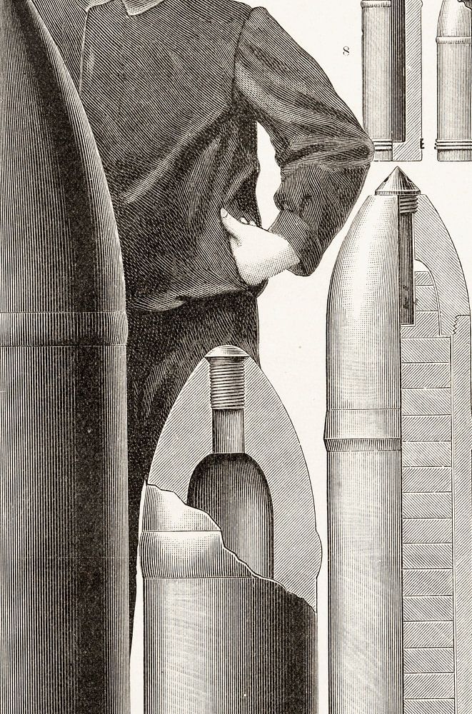This vintage engraving depicts 14 grenades that could be fired by artillery. For proportion and size, a soldier is depicted next to the grenades.
