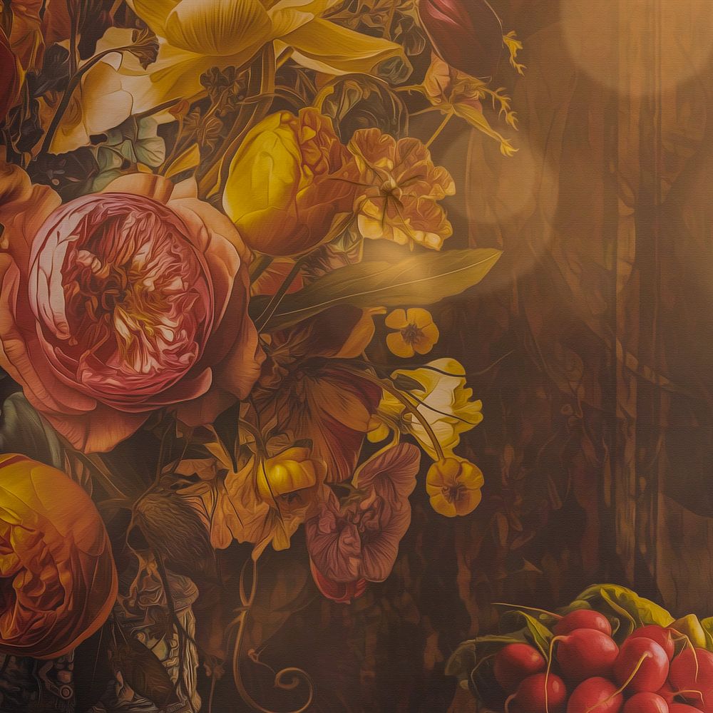 The antique vase with flowers stands on an old table, in front of an equally old background. It is reminiscent of the hall of an old castle or house. The bunch of flowers is lavish and colourful, The bouquet is large, lush and colourful and consists of different types of flowers. It contains beautiful large peonies, as well as lilies and tulips. On the table next to the vase of flowers is a bowl of radishes. An old shovel lies next to it. A lot of sunlight enters from the right. The sunlight streaming in accompanies a tropical bird flying in through an open window in search of, yes what is the feathered friend looking for. Perhaps the longlegs sitting on one of the flowers. This atmospheric still life is sure to look great in the living room, also in the kitchen or hallway, it will look good too. The colours of this classic still life are warm and classic, namely, orange red, brown, pink, yellow and cyan and that of course in multiple shades.