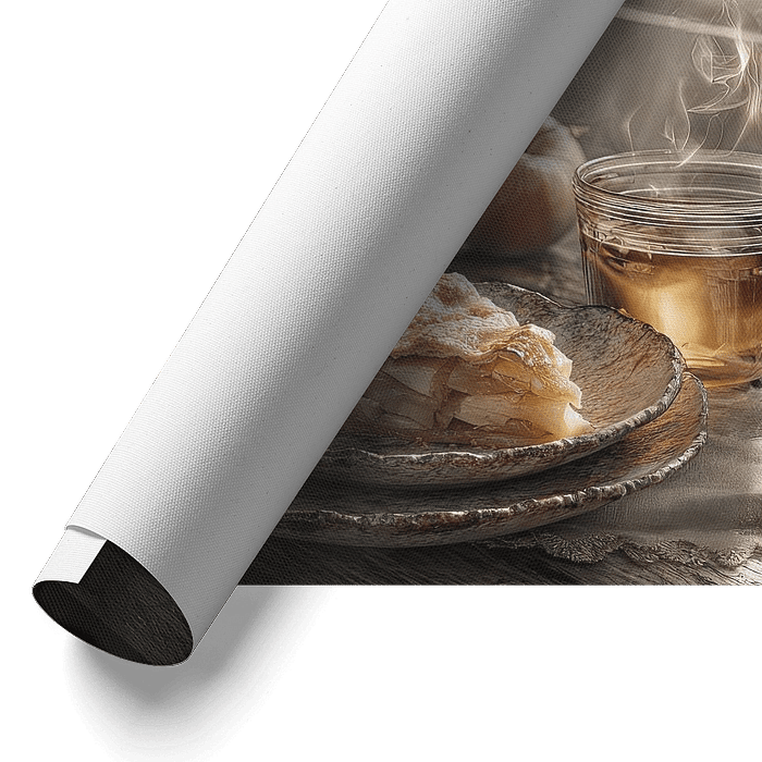 A still life with apple pie and tea in soft morning light, symbolizing homely warmth. Perfect for country and classic interiors, and an atmospheric choice for the kitchen or dining room. Timeless coziness captured.
