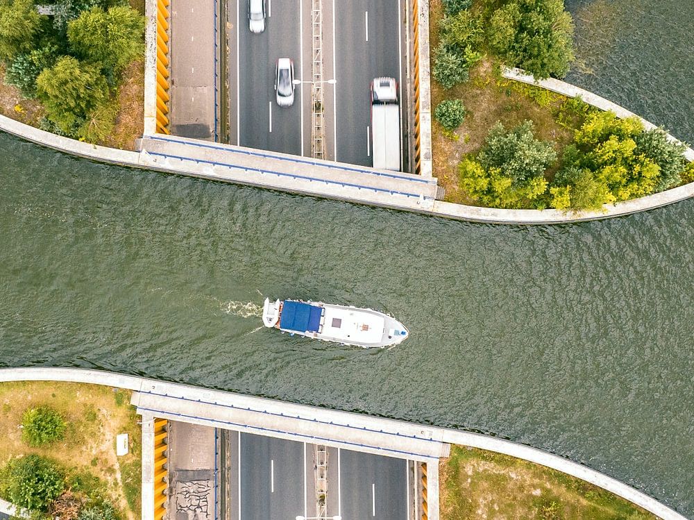 Aquaduct Veluwemeer in the Veluwe lake near Harderwijk where boats pass over the road. A pleasure yacht is sailing over the road where cars cross the water through a tunnel.