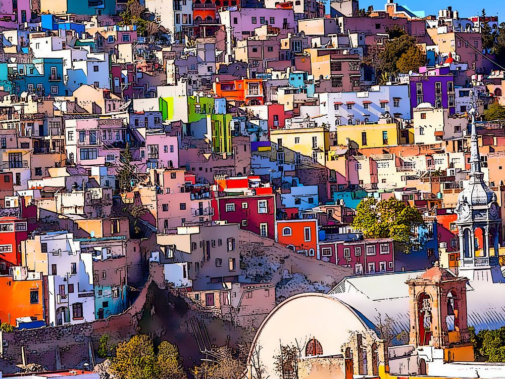 Dit is een aquarel tekening met zwarte schetslijnen van Guanajuato, Mexico. De originele tekening is omgezet in een digitaal bestand.