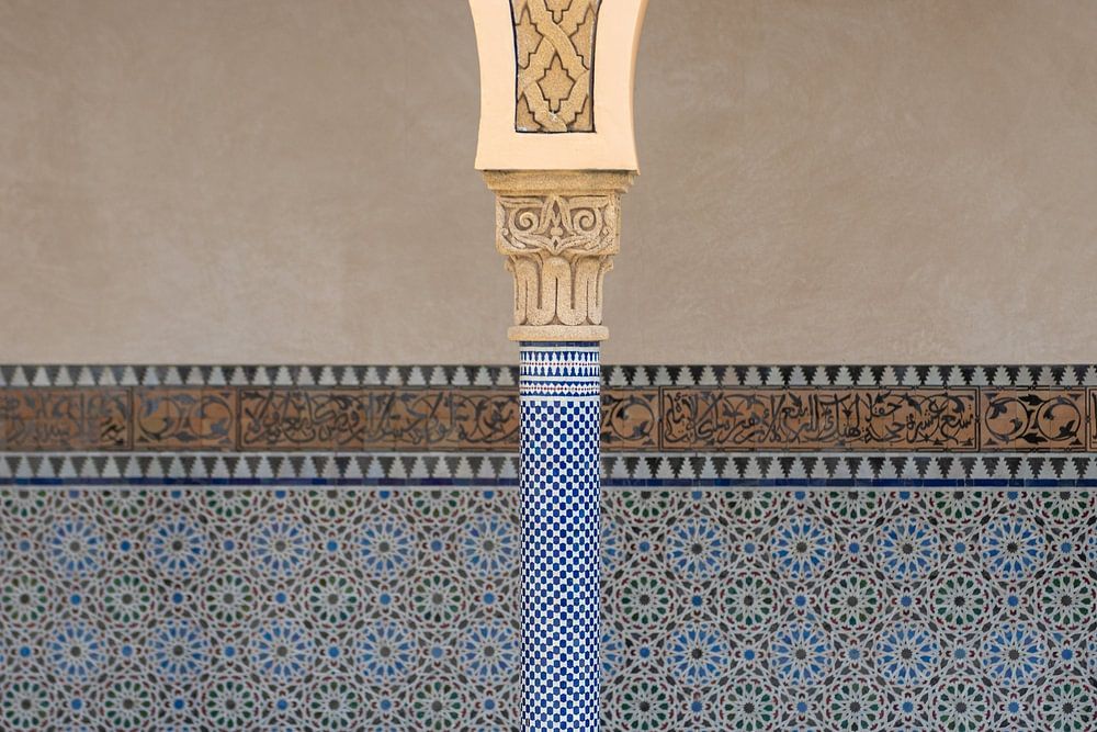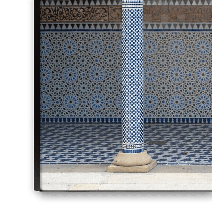 The picture shows three ornately designed arcades supported by richly decorated columns that radiate an atmosphere of mindfulness, relaxation and spirituality. The columns are covered with blue and white mosaic tiles, whose geometric patterns are reminiscent of traditional Islamic art. The arches themselves are in warm sandy tones and decorated with gold-coloured ornaments that lend the picture a noble and calm aura. The wall behind is also decorated with mosaics featuring floral and geometric elements in shades of blue and brown. This composition conveys a feeling of inner balance and invites meditative contemplation. The floor picks up on the pattern of the columns and creates a harmonious overall picture. The architecture is reminiscent of spiritual places such as mosques or palaces in North Africa and the Middle East, which are known for their combination of art and inner contemplation. The clear structure, calm colours and ornamental variety make the picture an ideal work for rooms that are intended to radiate calm and depth. It is particularly suitable for meditation rooms, cultural institutions or living areas in which mindfulness and spirituality are consciously practised.