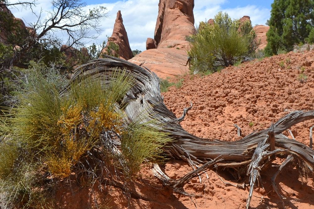 Devils Garden Trail in Arches. Along the way we pass dried out tree stumps. Curiously shaped.