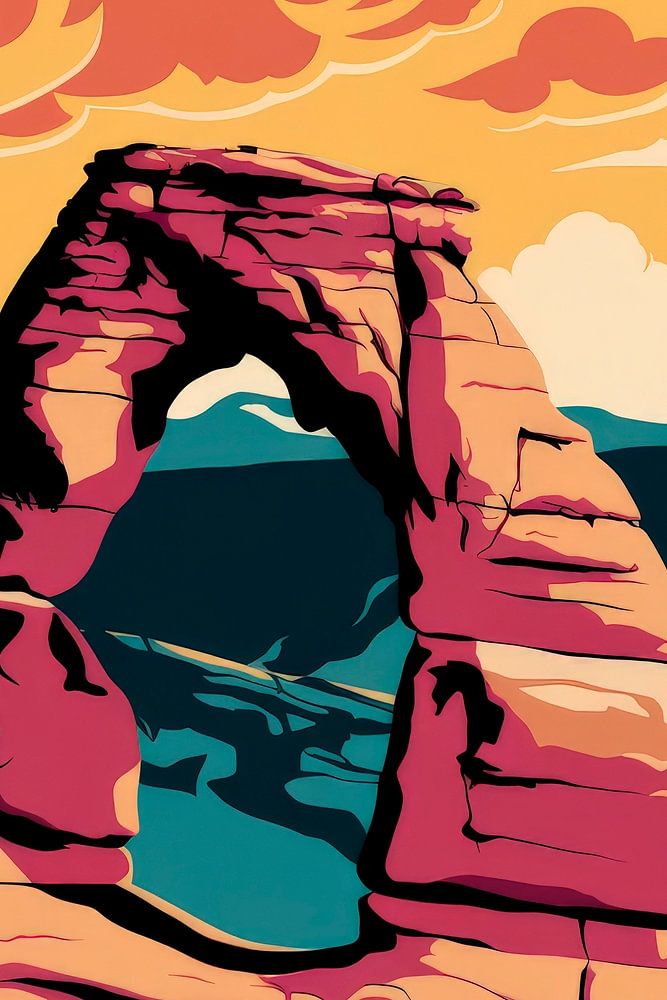 A majestic arch rises impressively against the dramatic sky, which glows in warm shades of gold and red. This artful depiction of nature captivates the viewer and transports them straight to the heart of Utah's Arches National Park. Ideal for a living room, it brings a spiritual connection to nature and enchanting colour to any room.