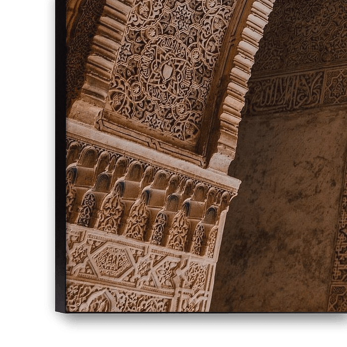 These graceful arches of the Nasrid palaces in the Alhambra are an impressive feat of Moorish architecture. The picture shows a series of elegant arches that follow one another, decorated with the most exquisite stucco. The delicate patterns composed of geometric shapes reflect the rich cultural heritage of Al-Andalus.