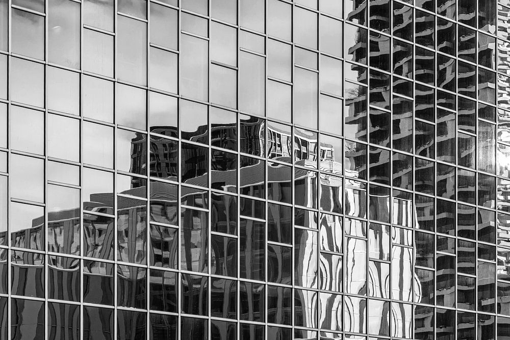 Architectural reflections in Utrecht (black and white). One of Rabobank's older buildings reflects several new architectural delights such as wonderwords and the Knoop. Also the Galaxytower, which is still unfinished at the time of photography, being 6 January 2026.