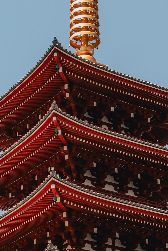 This photo shows the fascinating silhouette of a traditional Japanese pagoda with bright red roofs against a clear summer sky. The pagoda is a symbol of spiritual profundity, architectural mastery and cultural heritage in Japan. The curved roof lines, fine details and the golden spire reflect the harmony between man and nature that is lived out in Buddhist buildings. The typical wooden structures and ornamentation, which serve to protect and balance the Asian faith, are also emphasised. As a work of art, this picture is suitable for anyone who loves Japanese spirituality, architecture and temple photography. It brings meditative calm, aesthetic precision and the aura of historical buildings into rooms such as yoga studios, study rooms or hotel lobbies and is a window motif for inner contemplation and Far Eastern inspiration.