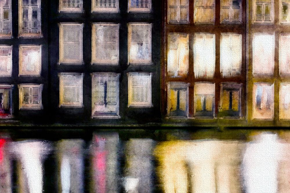 An expressionistic painting of architecture in Amsterdam at night. This highly detailed artwork is a skillful fusion of analog and digital illustrations in the style of classical art.