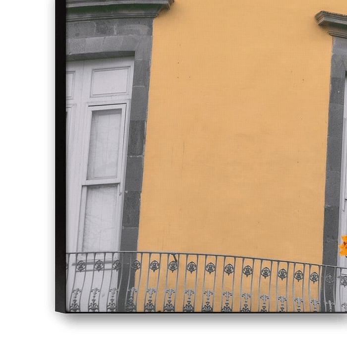 This picture shows the harmonious combination of architecture and nature on the Canary Islands. In front of a warm, yellow façade with elegant white windows and a wrought-iron balcony, a magnificent tree full of bright orange flowers unfolds. The contrasting colours - the lush green of the leaves, the vibrant orange of the flowers and the sunny yellow of the house wall - create a lively, Mediterranean atmosphere. This motif epitomises the typical flair of the Canary Islands, where colonial architecture meets lush vegetation. The picture is ideal for anyone looking for colourful, atmospheric photo art and wants to bring a feeling of summer, joie de vivre and lightness into their rooms. Whether in a living room, an office or a gallery, this work lends a warm, positive atmosphere to any space. It invites you to discover the beauty of Canarian cities and shows how architecture and nature can exist in perfect harmony.