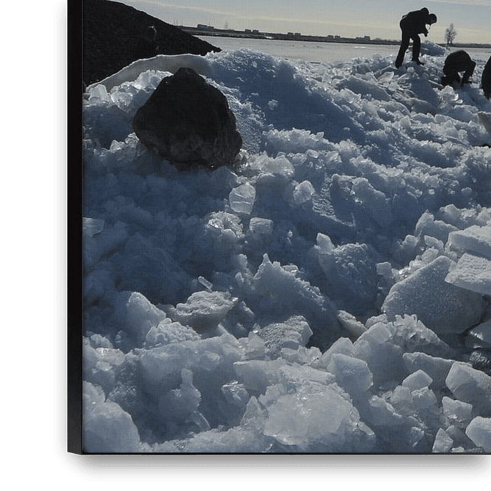 A bunch of tourists visit the cresting ice on the IJsselmeer. An impressive natural phenomenon that attracts many people, especially with such a beautiful blue sky.