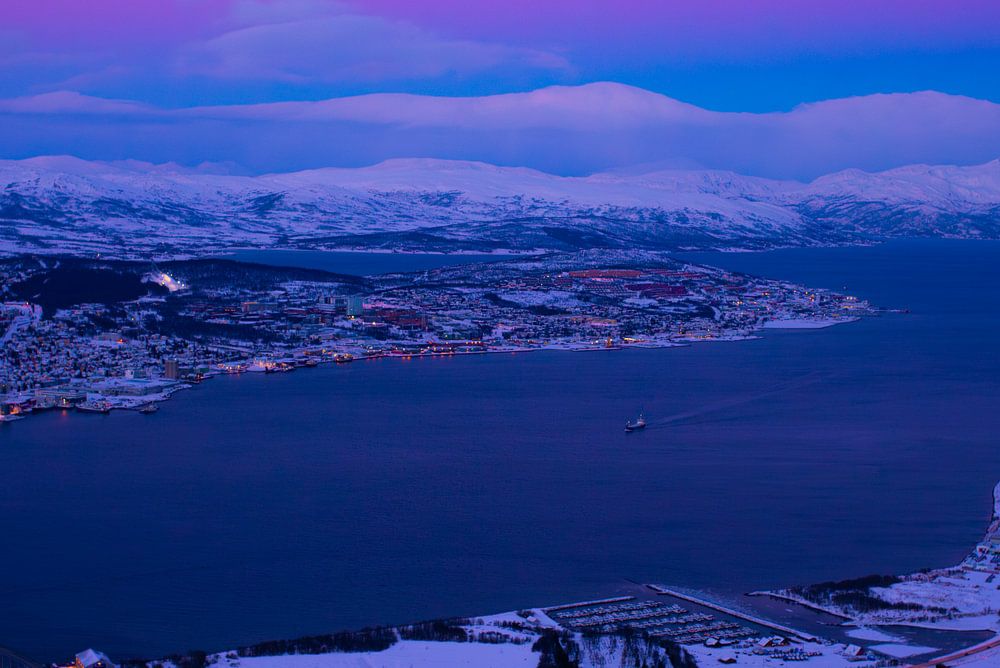 Take in the breathtaking beauty of Tromsø with this spectacular photo of the Arctic Panorama from the Fjellheisen cable car. Contrasting the purple-blue hues of the sky with the majestic mountain scenery and serene fjord, this unique image captures the pure essence of the arctic landscape. The Fjellheisen cable car soars high above the city, offering panoramic views perfect for wall decoration.