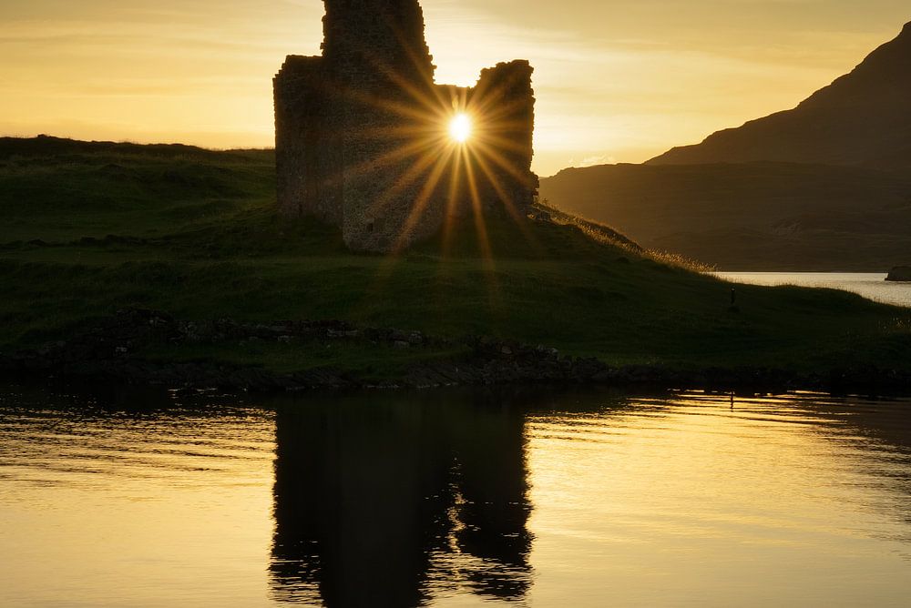 Ardvreck Castle reflections on Loch Assynt in sunset light, Scotland