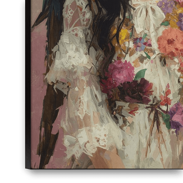 A poetic collaboration between nature and beauty: a melancholic woman with long dark hair wears a delicate white lace smock adorned with lush flowers in pink, purple, and gold. Two vibrantly colored macaws surround her like guardian angels, while the warm earth tones of the background create an intimate, dreamy universe. The work…