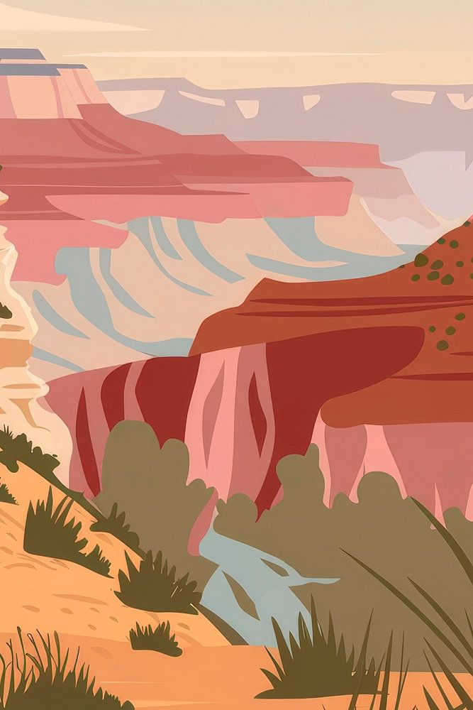 Soft pastel colours play around the majestic contours of the Grand Canyon, while the orange horizon shines in the distance. The minimalist depiction awakens wanderlust and a thirst for adventure. This artwork is perfect for the living room, where it stimulates conversation and creates a calm, inspiring atmosphere. Ideal for nature lovers and explorers!