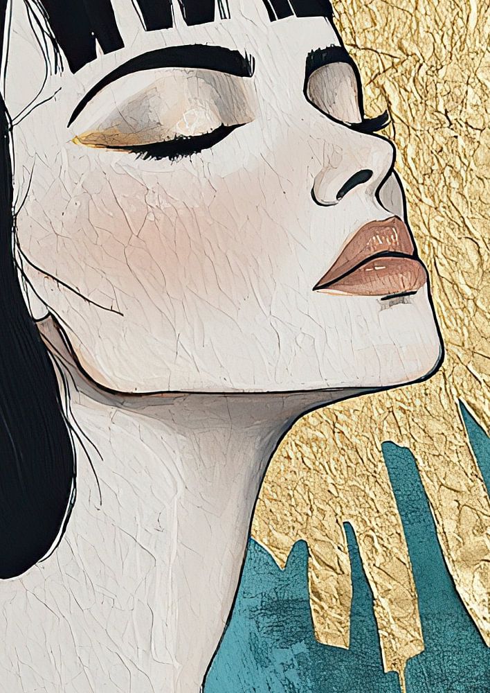 A beautiful woman with short black hair and fringes looking into the sun in profile, with gold foil accents on her face, against a textured blue-green background, in the style of a gouache illustration with hand-drawn texture and a celestial Art Nouveau aesthetic.