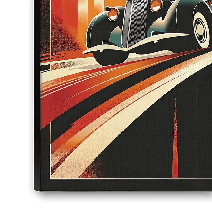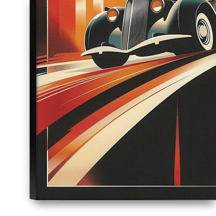 A vintage-style poster showing an Art Deco car on the road, with bold colours and geometric shapes. In the background is the skyline of a city at sunset, creating a sense of nostalgia for classic cars and Art Deco design. Vintage style illustration.