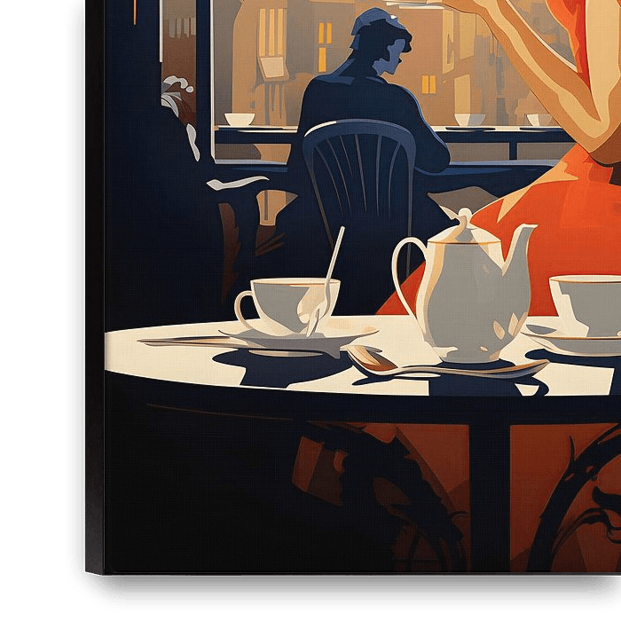An elegant Art Deco advertising poster for coffee, showing a stylish woman in a café looking out of the window onto the city street with a cup of coffee in her hand. The scene is designed in the typical geometric shapes and vibrant colours of the Art Deco style and exudes an atmosphere of luxury and elegance. A perfect poster to capture…